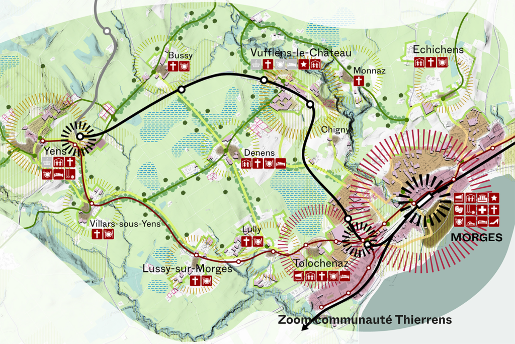 Der Entwurf baut auf den freiräumlichen, baulichen und sozialen Qualitäten des Ortes auf. Die Grundidee sind Freiraumbänder – in ihren Qualitäten unterschiedlich geprägte Achsen, die sich aus bestehenden Strukturen ableiten, Lücken ergänzen, Freiräume verknüpfen und so zu einem robusten Gerüst geformt werden. Dieses Gerüst bildet nicht nur die Grundlage für eine schrittweise und bedarfsgerechte Entwicklung der Baufelder, sondern dient auch als Bühne des öffentlichen Lebens, auf der Begegnung, Aufenthalt und Alltägliches selbstverständlich zusammenkommen. Unterschiedliche und dem Ort entsprechende Gebäudevolumen sorgen für eine harmonische Einbindung der neuen Bebauung in die Nachbarschaft und schaffen ein neues, attraktives Gegenüber für die Brugger Bahnhofsseite. Gleichzeitig werden historische Spuren integriert – wie die Villa Brunegg oder das Kesselhaus –, um die Geschichte des Ortes und die Identität zu wahren.